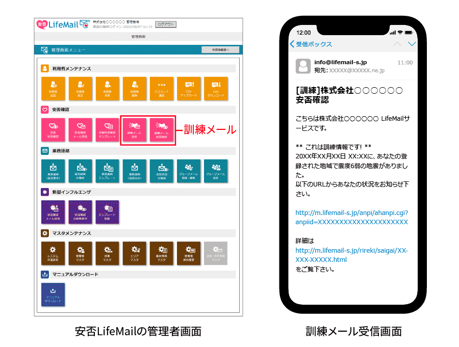 安否確認システム「安否LifeMail」には、訓練メール機能が標準搭載されています。